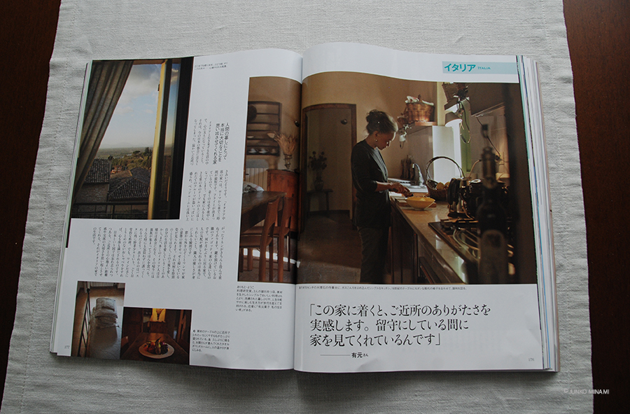 私が好きな料理研究家のかたは何人かいますけれど、そのうちの一人の有元葉子さん。イタリア↔東京↔信州の、三つの家を行ったり来たりで過ごしていらっしゃるそうです。「一人の時間と、誰かと過ごす時間を両方楽しむために」という特集。このページは、イタリアのお家のキッチンでのものです。
