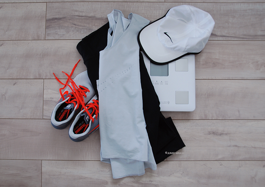 トレーニングは絶対に「無理をしない。けがをしないように。」しています。写真に写っているキャップは、毎朝の自転車10分でも日焼けをしないようにするためのもの。また、大雨でも行けるようにとレインコートも買いました。すべてAmazonやその他のネットで買ったものです。体重計も新調。とてもシビアな意見を言うパートナーです。