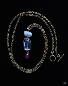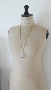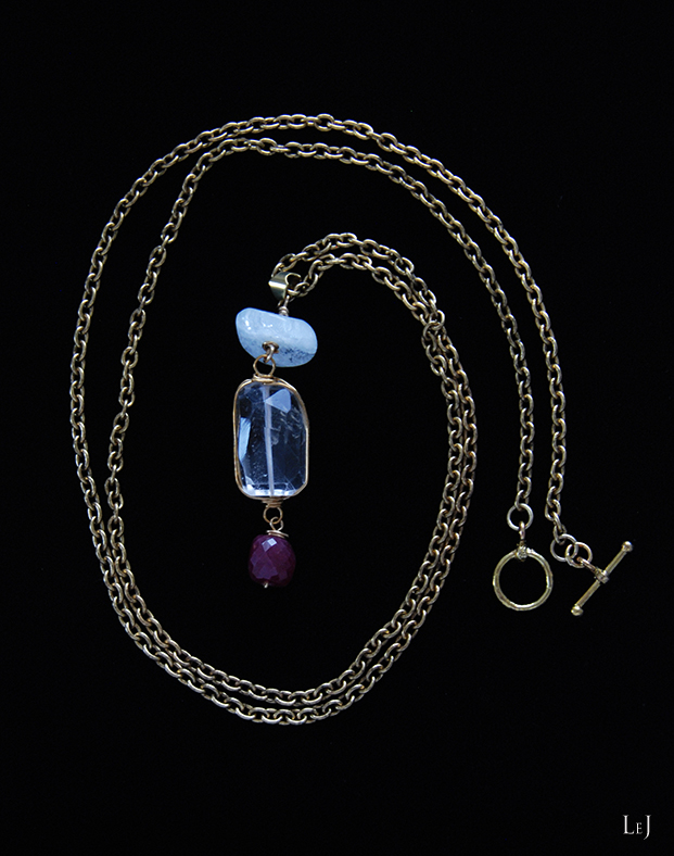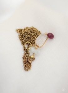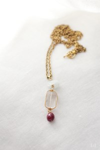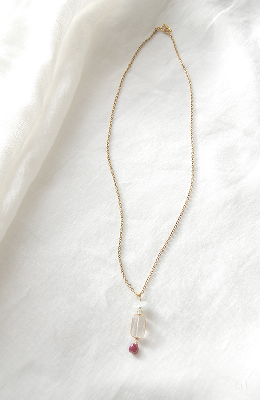 すべらかなカットのアクアマリンは、LeJがストックのなかから少しずつ使っているもの。クオーツをワイヤーで大切にくるんで、その先にはクランベリー色のルビーがゆらゆら揺れるネックレスに。