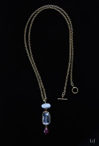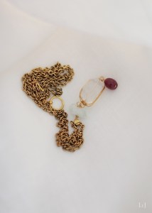 クオーツをワイヤーで大切にくるんで、その先にはクランベリー色のルビーがゆらゆら揺れるネックレス Pierre1 をONLINE STOREに公開しました。