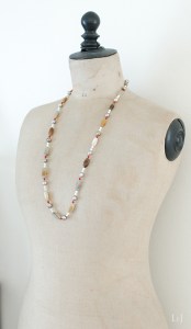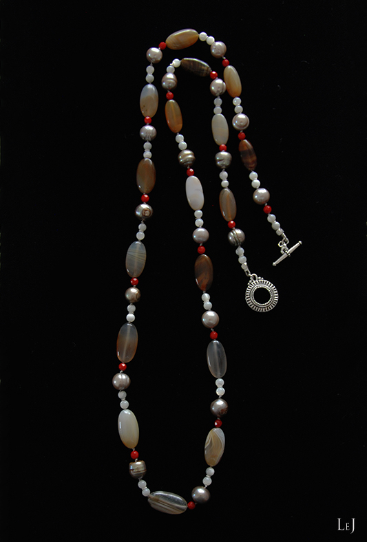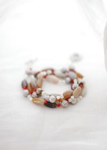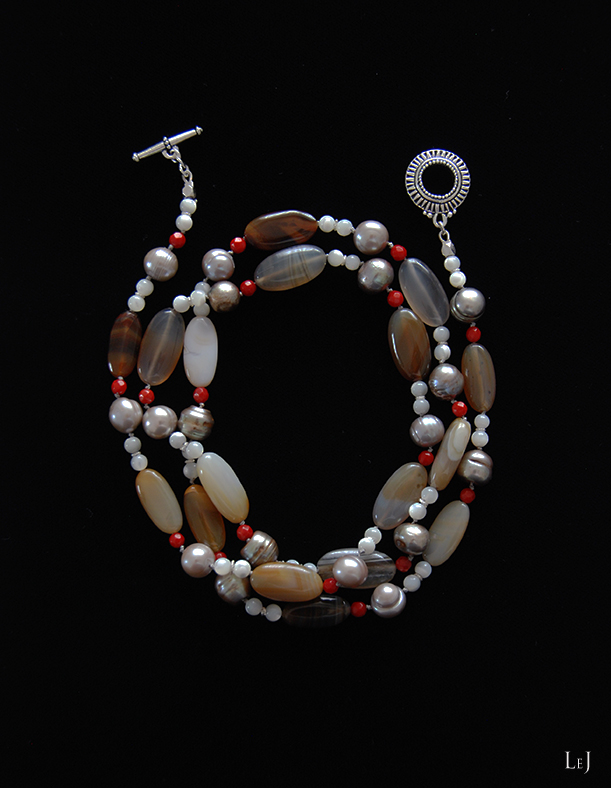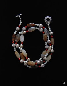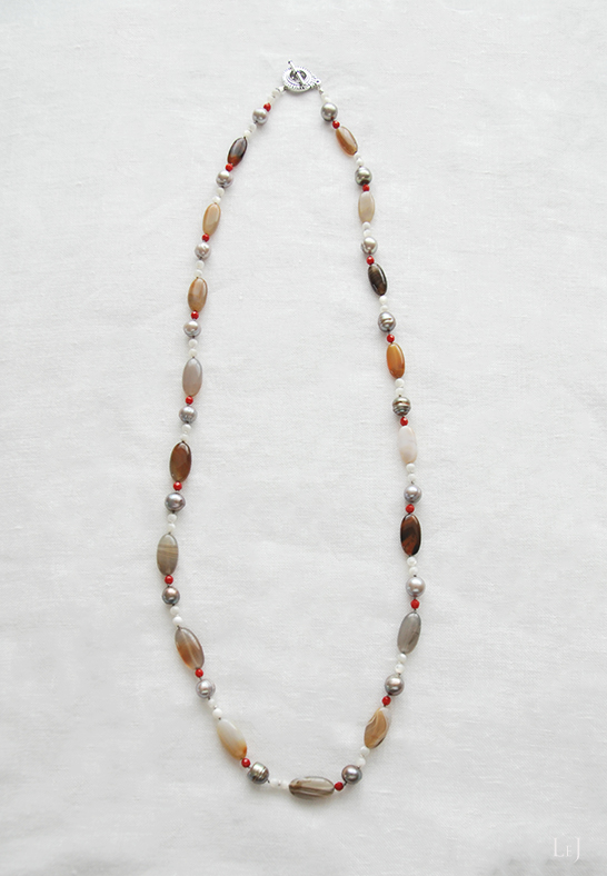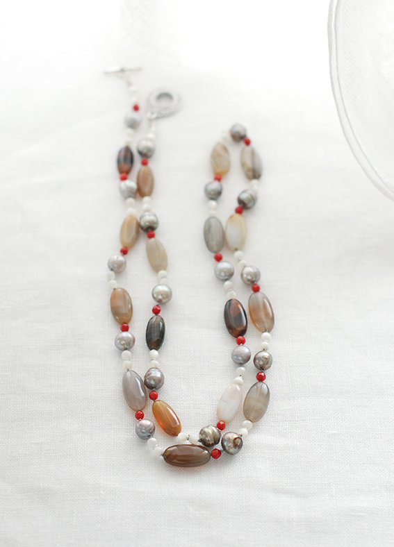 Pascale(パスカル)は、クリアレッドのレッドコーラルやマザーオブパールにアゲートが落ち着きを添えるネックレス。
