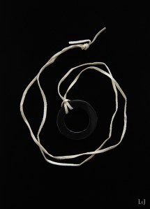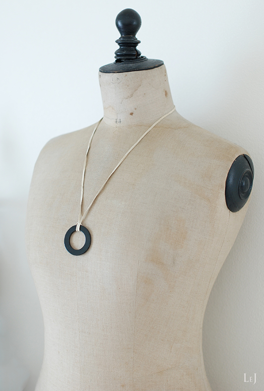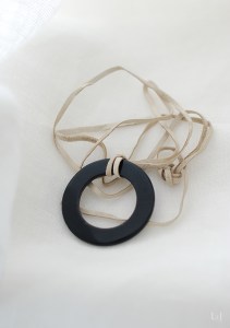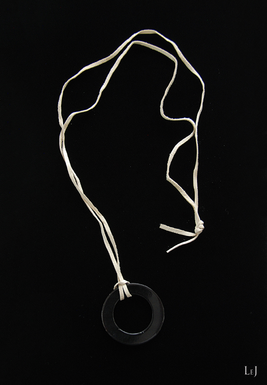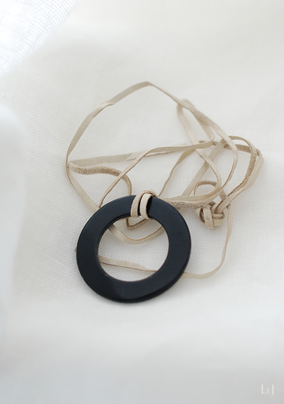 着けているのを忘れてしまうほどに軽いけれど、ほのかな墨色のトップのホーンは⌀45mmの厚さ3mm、たしかな存在感。革紐には左右に47cmの長さがあるので、短く結べば80cmのネックレスに、リボン結びにして華やかに結び目を活かしたアレンジも出来ます。