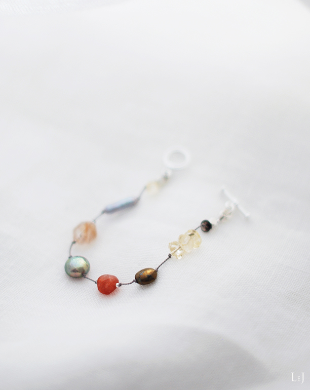 夏のリゾート、そして少しの秋の気配へ。肌に乗せると、きらきら輝く天然石の華やかさと同時に、大人の女性ならではの可愛らしさを引き立てるブレスレット。リスト周り内径13cm。