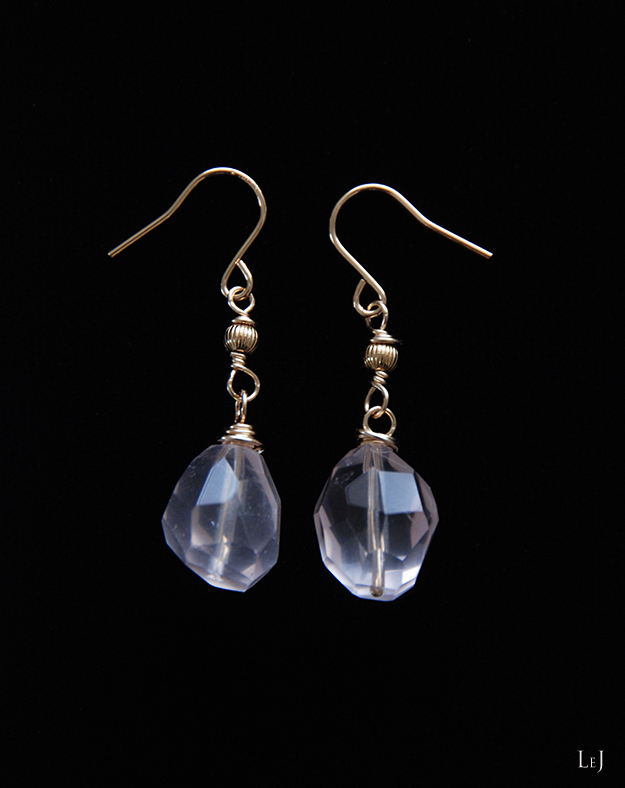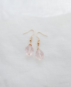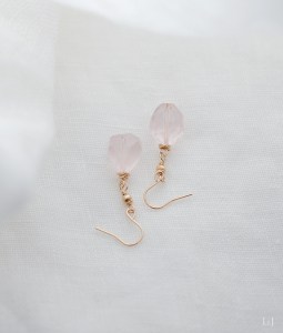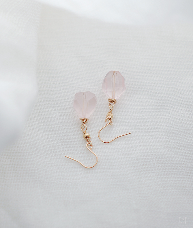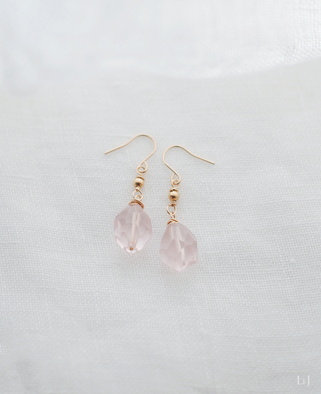 とても丁寧なハンドカットがほどこされたクオーツに、K14ゴールドフィルドパーツがよく合います。テクスチャーの入ったパーツと、ぐるぐると巻いたワイヤーが小さなポイント。フェミニンなウエアに、ブラックのセーターに合わせてシックに。大人のピンクのアクセサリー。ピアスパーツからの長さは37mm。
