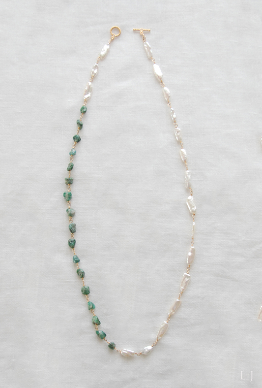 ラフカットのエメラルドと美しい照りのスティックパールがおたがいを引き立て合って、デコルテを優しく飾ります。エメラルドは美しい貴石、連なると見事な存在感を持ちます。四季折々の歓びが嬉しく感じられる、愛おしいネックレスになりました。