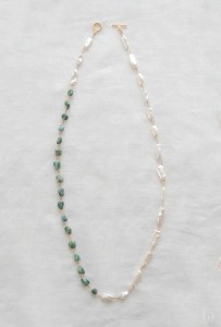 長さ65cm。セーターの袖の上からブレスレットにすると、くっきりとグリーン&ホワイトが引き立ちます。K14ゴールドフィルドワイヤーで繋ぎ、プレーテドブラスのマンテルを付けました。