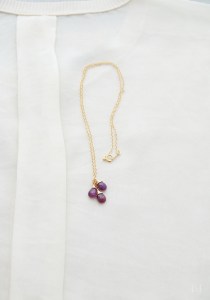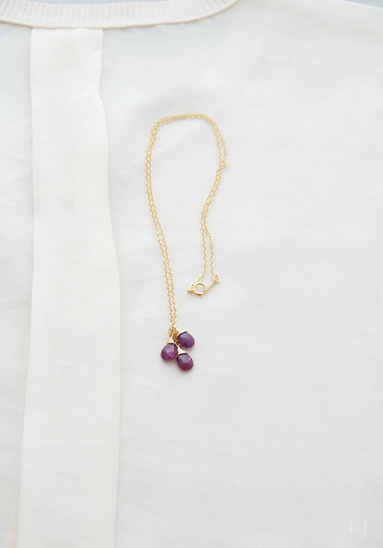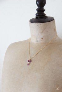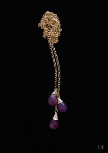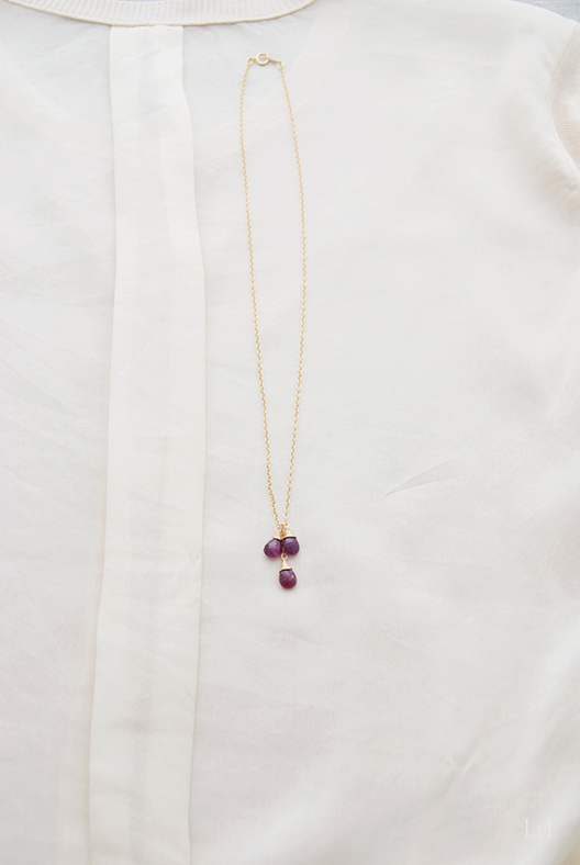 長さは46cm、10mm×6mm×5mmのころんとしたバーガンディ色のサファイアにK14ゴールドフィルドワイヤーをたっぷりと巻いた、ラグジュアリーだけれど温かみのあるデザイン。LeJは今までたくさんのサファイアのアクセサリーを作って来ましたけれど、この一点も、お手に取っていただければその美しさにきっと頬がゆるむアクセサリーです。