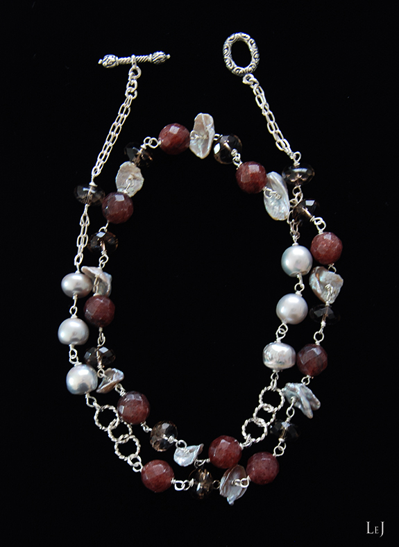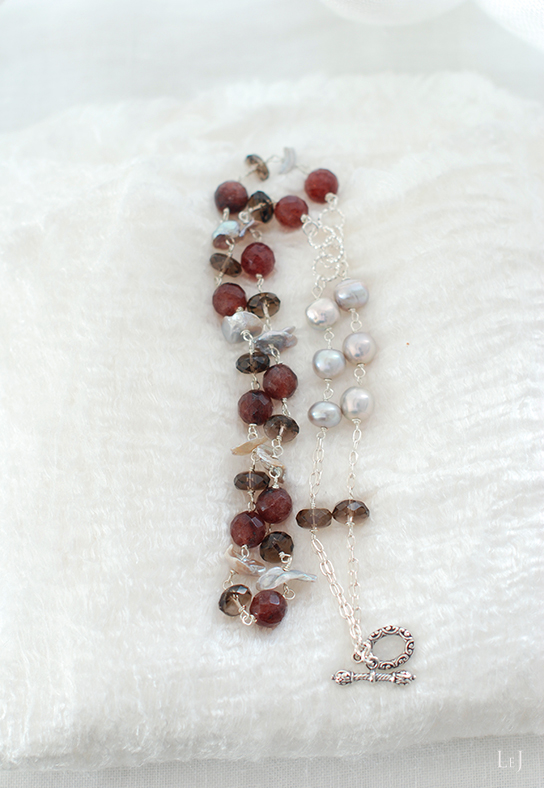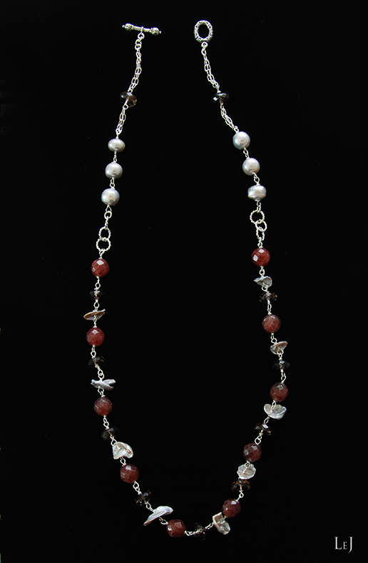 全体の色調を微妙に抑えてコントロールして、美しくデコルテに添うパールを活かしました。ロープ形状のシルバー925リングを配したり、やわらかな動きを大切にしています。