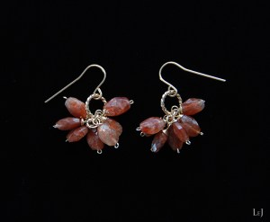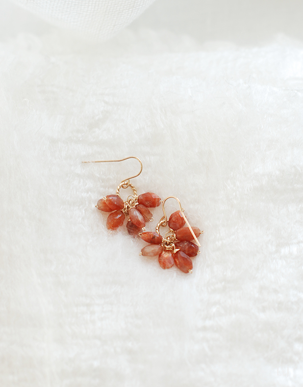 小さなサンストーンをブーケのように束ねて、ゆらゆら揺れるピアスにしました。