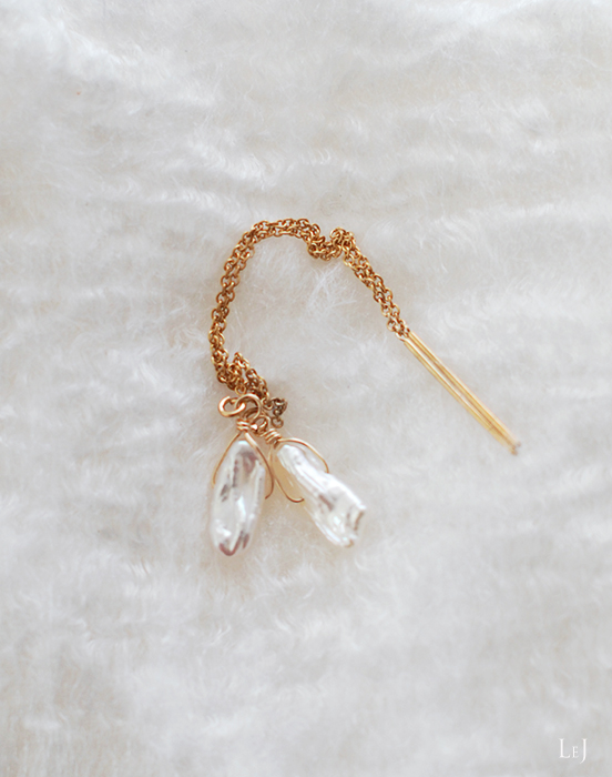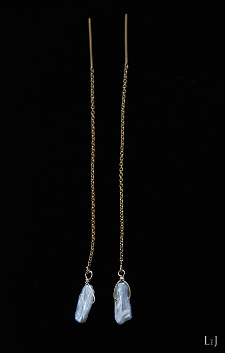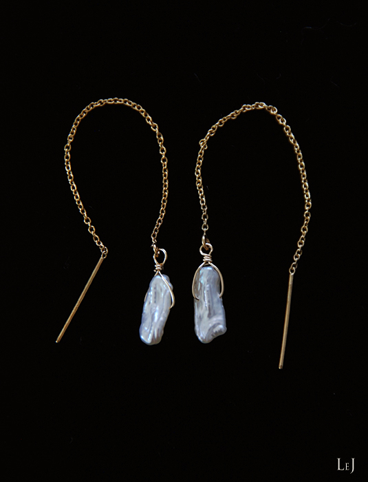 LeJでは、チェーンを後ろに長く垂らせる付け方をお薦めしています。ピアスの全長97mm。パールは8mm。