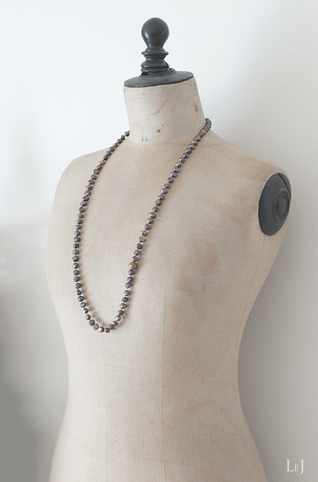 ピーコックカラーで抑えた色調のなかに光を放ち、シンプルなニットをぐっと引き締めて個性を持たせます。パールはほどよいボリュームの8mm。ゴールド色のパーツは⌀12mm。長さ87cm。