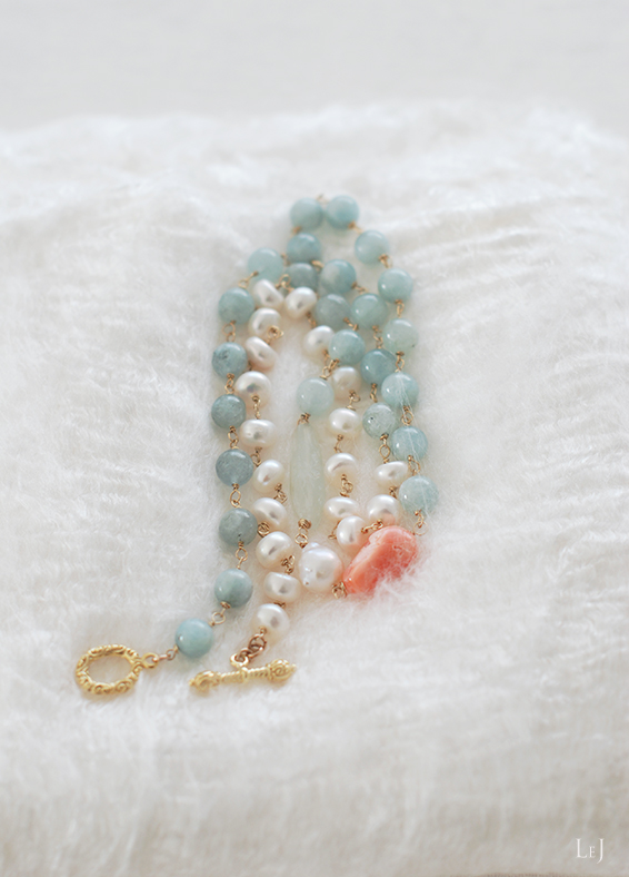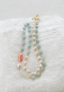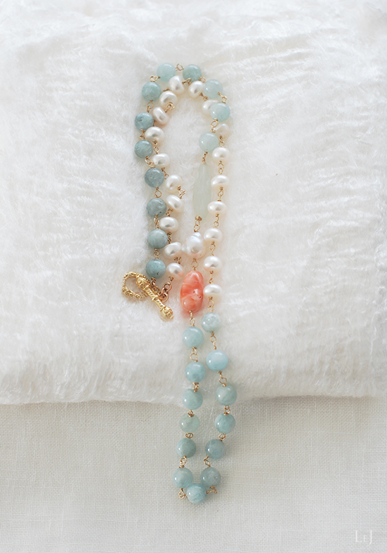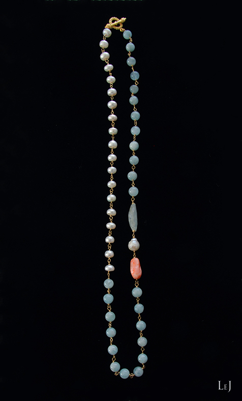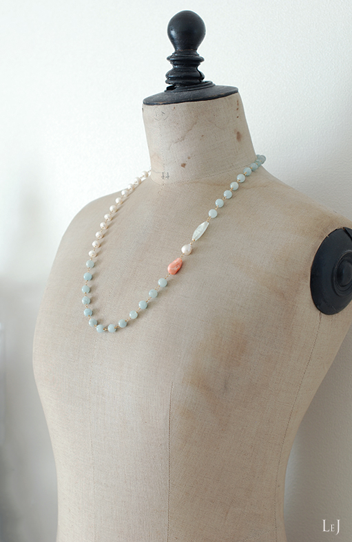 大粒のアクアマリン・有核パール・珊瑚をメインにして、静かなマチエールを抱くアクアマリンと照りの美しい白い淡水パールを紡いだネックレス、 Félicité(フェリシテ)のページ をONLINE STOREに公開しました。