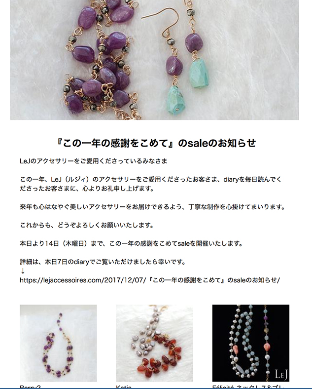 LeJでは、ONLINE STOREでフォローしてくださっているお客さまやご購入くださったお客さまに、不定期でメールマガジンを発信しています。
