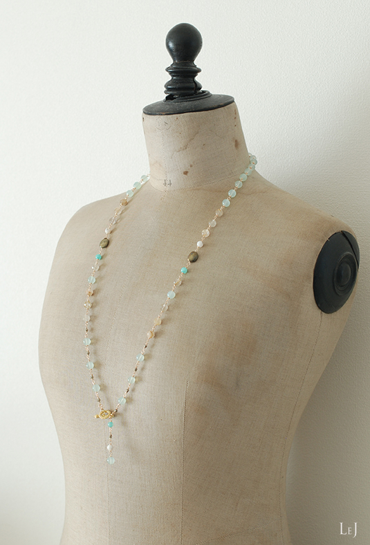 ぷちぷちしたグリーンカルセドニーと素敵なマリアージュを作るルチルクオーツには丁寧なカットが入って、きらきら光を放ちます。小さなグリーンは、LeJでは初めて使う天然石のヘミモルファイト。二種のカットのパイライトをアクセントにして、82cmのネックレスに。クラシカルなマンテルに45mmのチャームを付けて、バックスタイルにもアクセントを付けました。