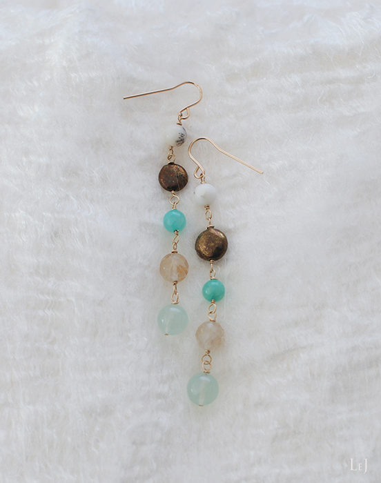 ぷちぷちしたグリーンカルセドニーと素敵なマリアージュを作るルチルクオーツには丁寧なカットが入って、きらきら光を放ちます。小さなグリーンは、LeJでは初めて使う天然石のヘミモルファイト。