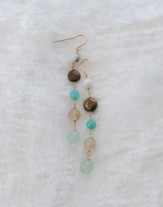 モノトーンなど、沈みがちな秋冬のウエアに、美しい色彩の天然石のネックレスやピアスをそえてみてください。とくにお薦めなのは、ベージュやエクリュのシンプルなニット。ブラックやカーキやネイビー、ホワイトにももちろんよく合います。タンブルカットのカルセドニーをY字ネックレスにした Pierre2ネックレス ともよい相性です。ピアスホールからの長さは72mm。