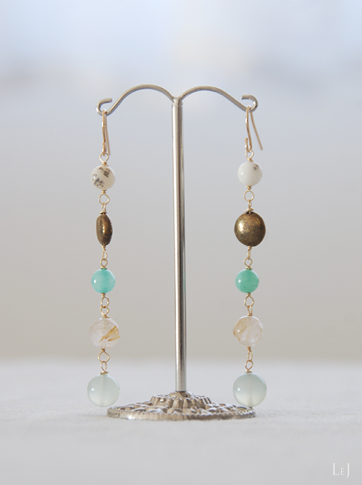 素材:グリーンカルセドニーラウンド・ルチルクオーツファセッテドラウンド・ホワイトオパールラウンド・パイライトコイン・ヘミモルファイトラウンド・K14ゴールドフィルド