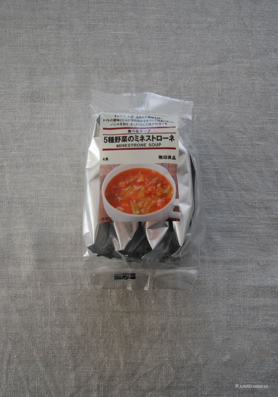 5種野菜のミネストローネ。無印良品の、フリーズドライのスープです。もの作りをしているからか真面目に自社製品を作っているブランドが好きで、よく店舗に足を運びます。行くと、一点は感心するものを見つけます。