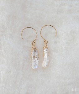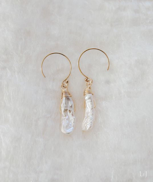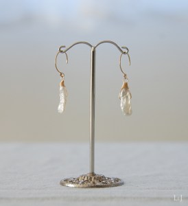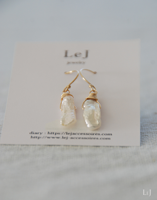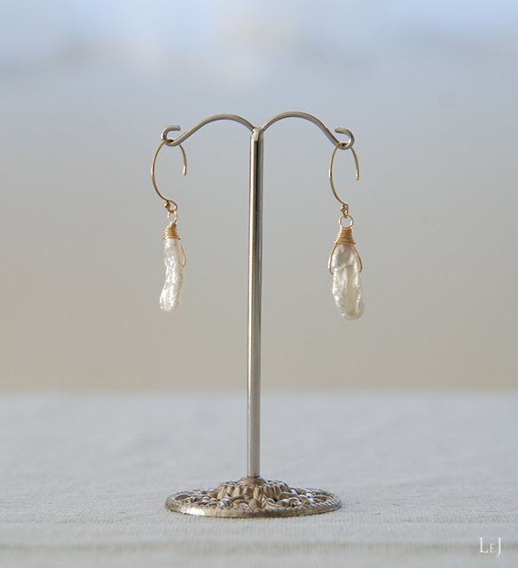 シルクタフタのような光沢をもつクリーミーホワイトのパールをK14ゴールドフィルドのワイヤーで丁寧にくるみ、繊細なピアスパーツと相まってアンティークジュエリーのような表情を持つピアスになった Lia35。