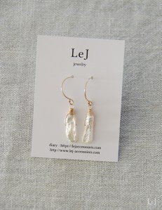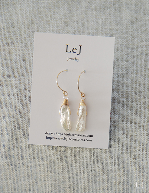 パールのリングやブレスレットとコーディネートしたり、白いシャツに合わせたり、ふわふわしたニットに合わせたり。合わせるものの雰囲気をがらりと変えるニュアンスを持ったアクセサリーです。パールは18×6、ピアスの全長38mm。