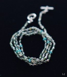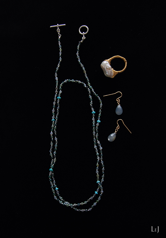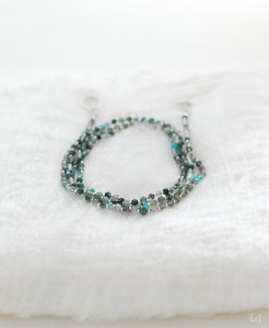 長さは83cm。4連のブレスレットにしたり2連のショートネックレスにしたり、バッグのハンドルに巻き付けてみたり、コーディネートをお楽しみください。最下段の画像ではサファイアの Lia38ピアス とコーディネート、サファイアの華やかさにも負けない存在感を持ったアクセサリーです。