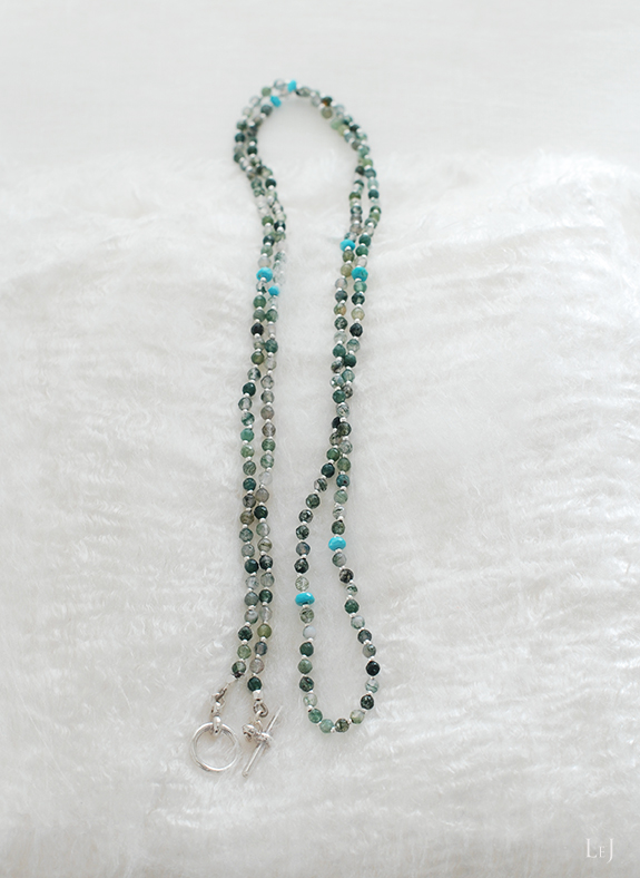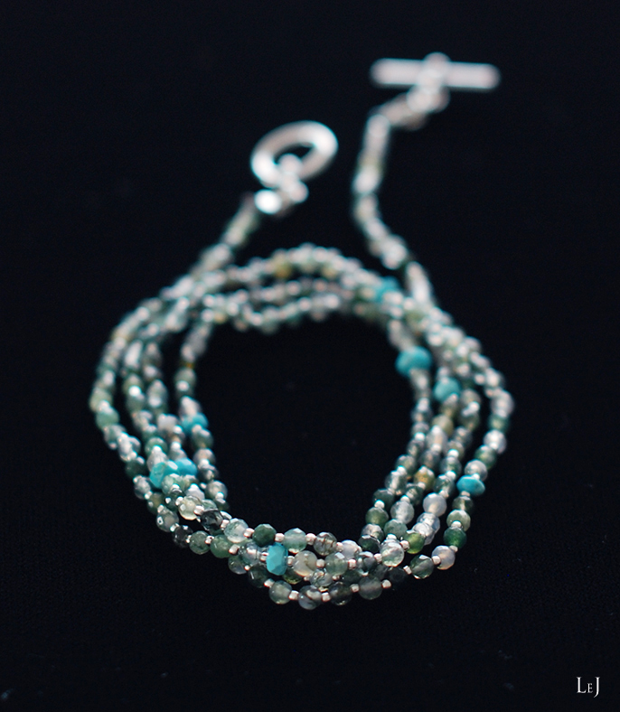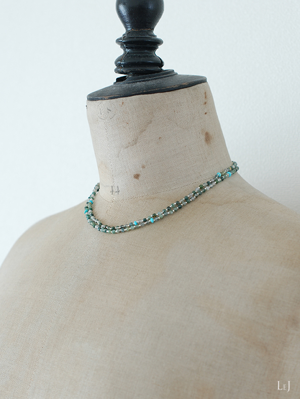 グリーンからペールベージュへの色彩の揺らぎ、丁寧なカットがほどこされた⌀3mmのモスアゲートにスリーピングビューティターコイズでアクセントをつけ、小さなちいさなメタルパーツを添えました。モスアゲートをひとつぶずつ丁寧に結び留めているので、女性のからだのラインに美しく沿います。