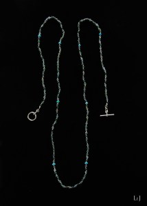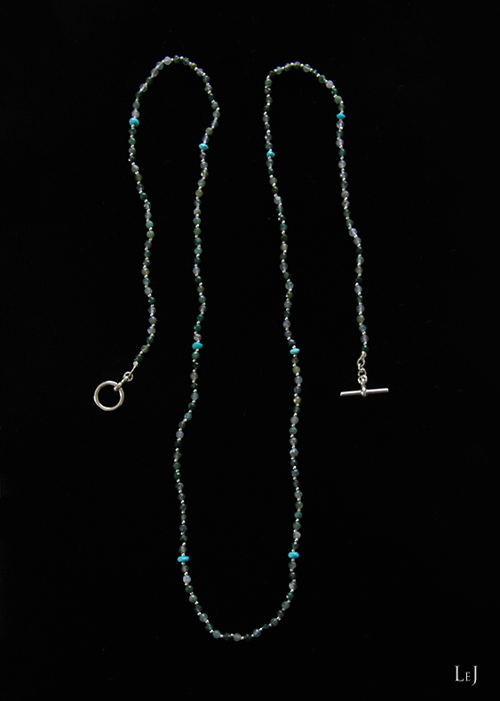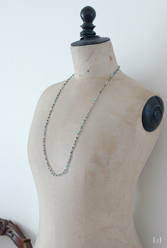 春先のニットやコットンのトップスそしてデニムとも相性がよく、デコルテできらきらと光沢を放つネックレス。制作中にもなんとも言えない幸福感を感じさせる素材でした。画像で、ぜひその美しさを拡大してご覧いただければ嬉しく思います。また、普段は大粒の天然石のネックレスをご愛用のお客さまにもお薦めしたい、落ち着いた存在感があります。