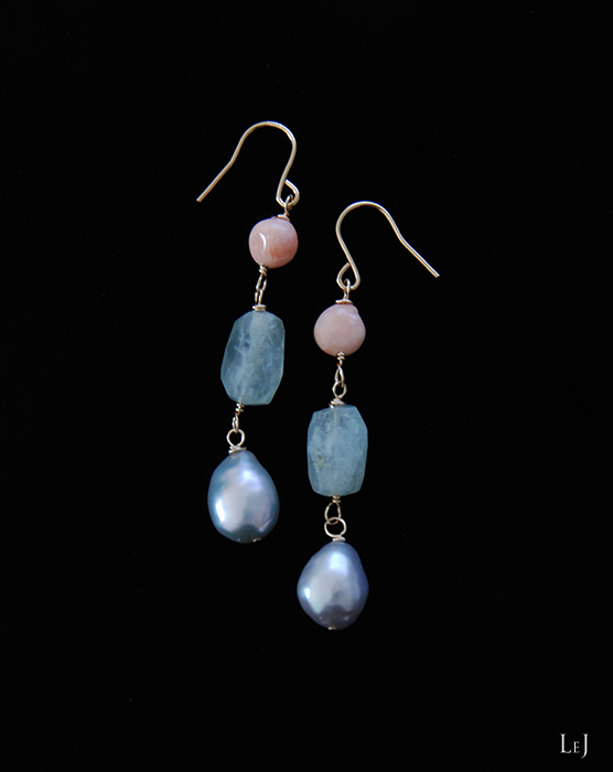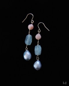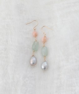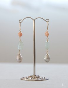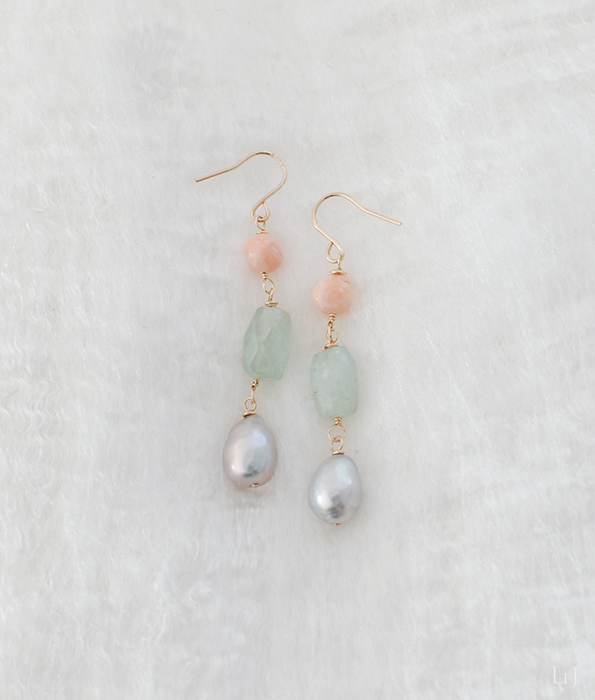 天然のピンクコーラル、うっすらとグリーンがかったアイスブルーのアクアマリン、そしてプラチナグレイの淡水パール。