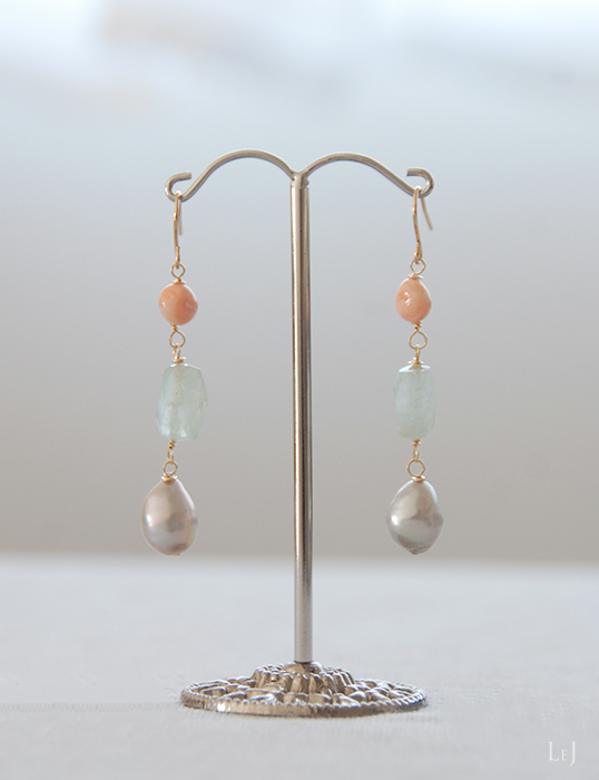 どれもLeJではお馴染みの素材で、春の陽射しを思わせるピアスを作りました。LeJでは、いつもアクセサリーをとても大きく写してご覧いただいています。それは、素材そのものが持つドラマティックなニュアンスをご覧いただければと思うからです。