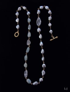 ペールページュからアイスブルー、オーシャングリーンへと移ろうトーンのアクアマリン。その反対側には22mmの大粒のアクアマリン。ちょうどデコルテのあたりで静かなイリデッセンスを湛えて、ウォームシルバーのパールと溶け合うような空気感を作ります。