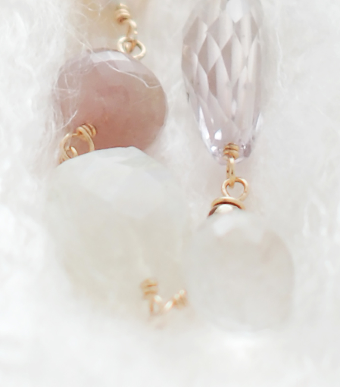 画像の調整をしていて、あまりのその美しさにはっとしました。右上から時計回りに、ピンクアメジスト、レインボームーンストーンのファセッテドオニオンカット、ホワイトムーンストーンタンブルカット、そして薄いうすい葡萄ジュースのようなサファイアのファセッテドラウンデルカット。