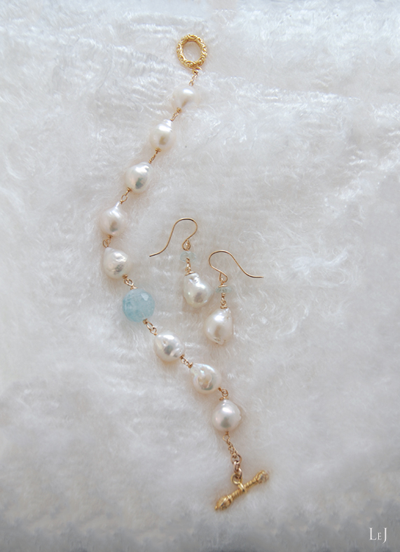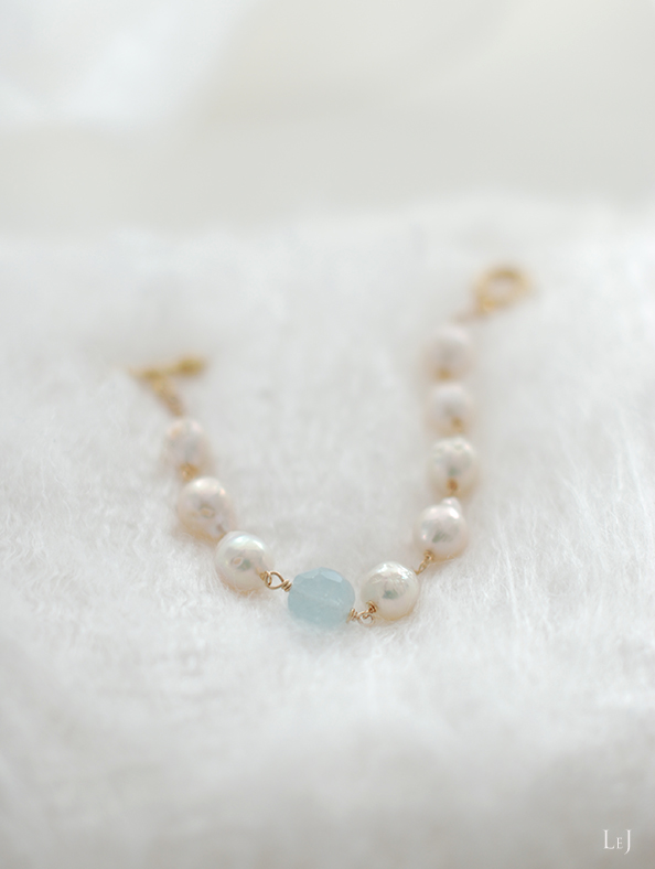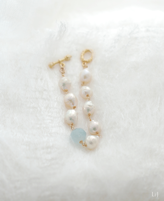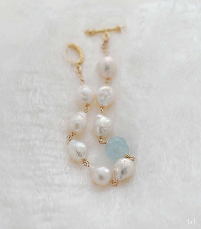 微睡むような素材たち。12×10×10mmの有核パールとパールと同じようなころんとしたかたちのアクアマリンは、とてもめずらしい大粒⌀12mmの微睡むようなカット。触れているだけで幸福感が湧き上がって来るようなアクセサリーに仕上がりました。