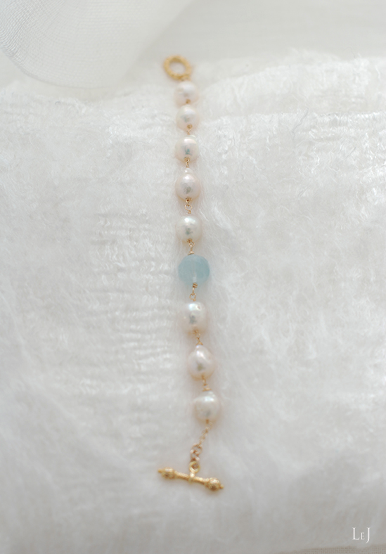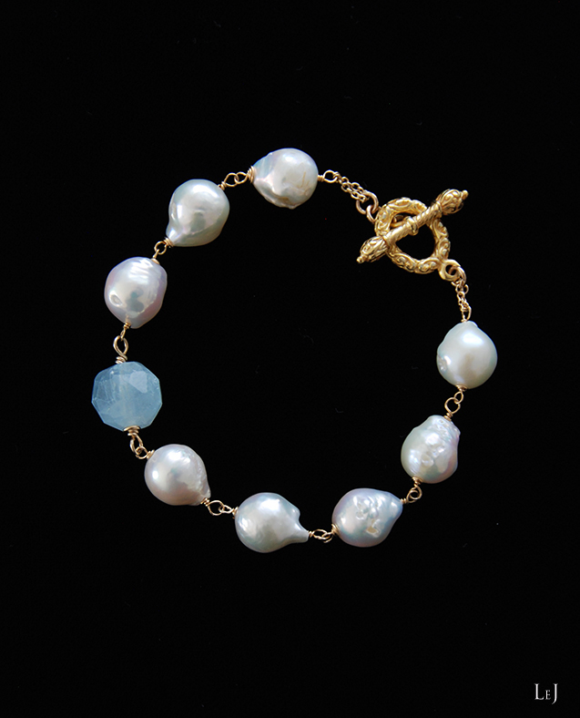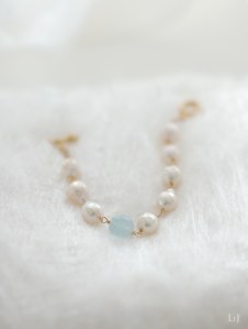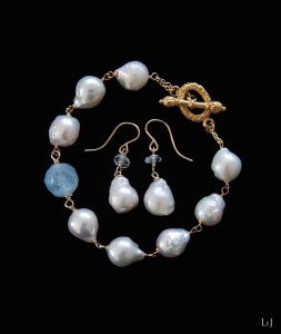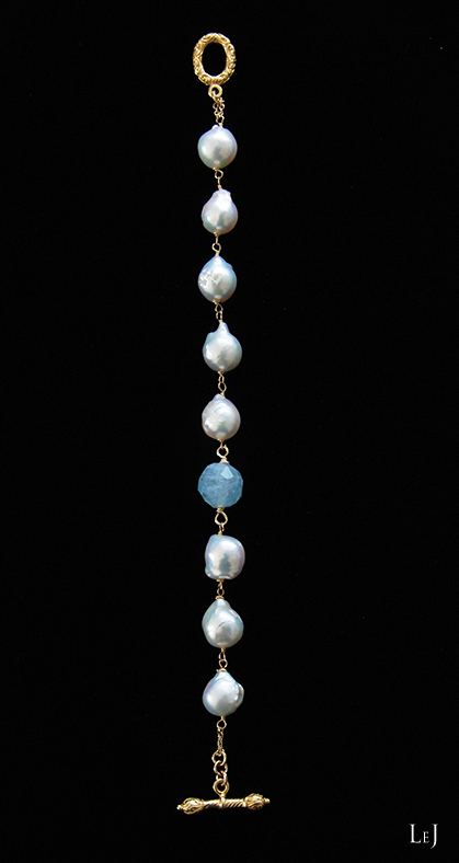 アクアマリンは着けたときにセンターに来るのではなく、時計の文字盤の2時のあたり。ゴールドとの相性がとても美しい、バロックパールとアクアマリンとのマリアージュをご覧いただければと思います。