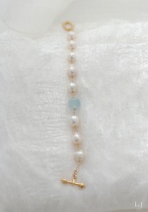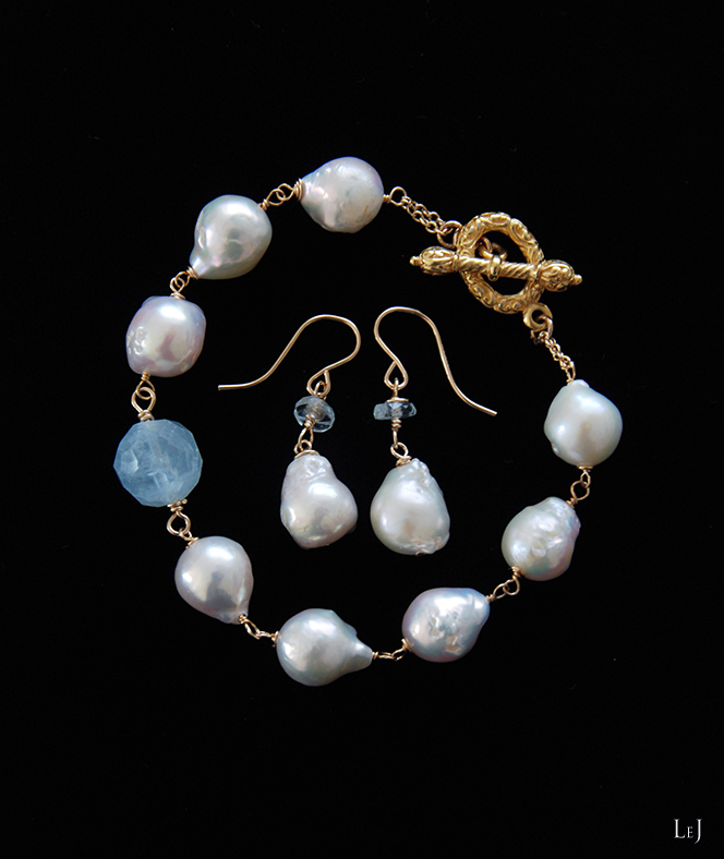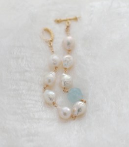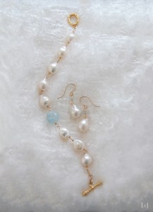 素材:アクアマリンファセッテドラウンド・有核バロックパール・K14ゴールドフィルド・ヴェルメイユ