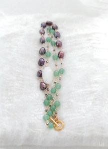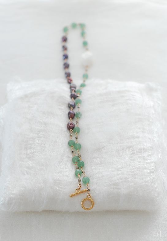 ゴールドとの色合いがとても素敵なグリーンアベンチュリンにホワイトオパールを一粒、大人の女性らしいピーコックカラーがスパイシーなパールと紡いでいます。ベージュやエクリュのトップスに、春先から初夏の風をはらませて着けてください。