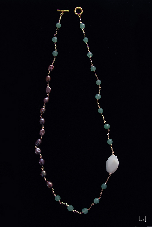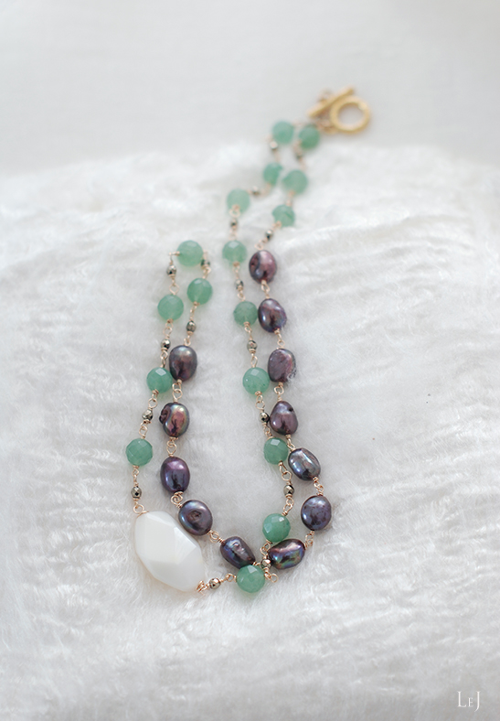 素材:ホワイトオパール・ピーコック淡水パール・グリーンアベンチュリン・シルバーパイライト・アーティスティックワイヤー・ヴェルメイユ