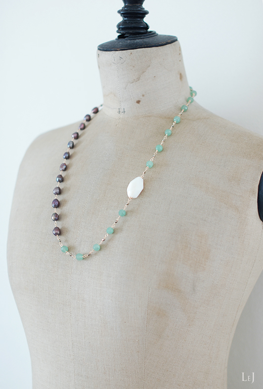 長さ70cm。コロニアルやスパイシー、エキゾチシズムという言葉がぴったりのネックレス。ホワイトオパールのタンブルはとてもめずらしいもの。大きさは28×16×8mm。