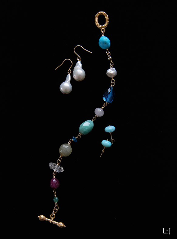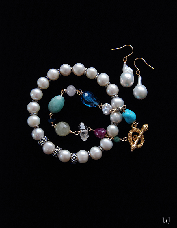 撮影をしていると、天然石が息づいているように感じます。LeJのアクセサリー同士はとても仲が良くて、過去に商品と一緒に作って私自身が使っているパールのブレスレットと合わせてみると、ぴったりでした。こうして、同じ素材がひとつ入っているだけで、コーディネートを楽しめます。
