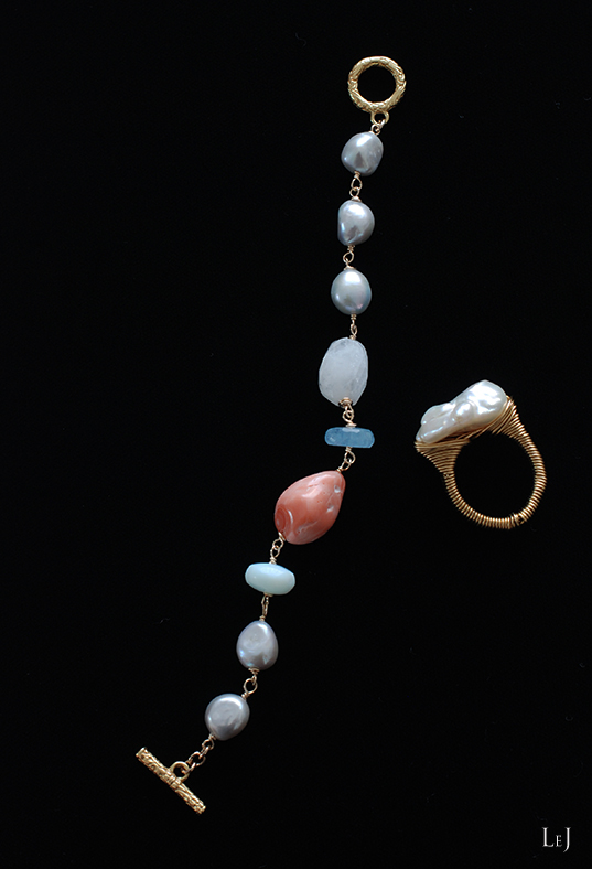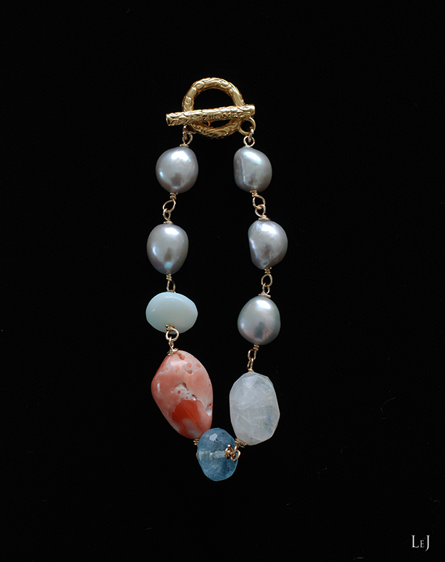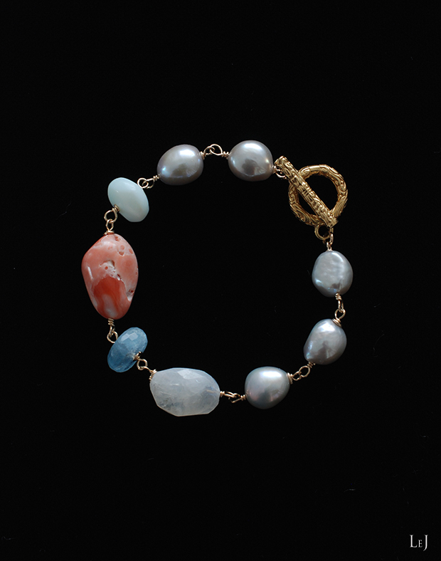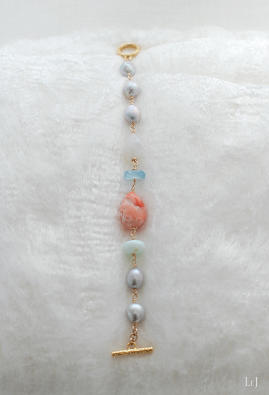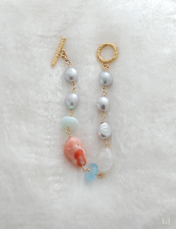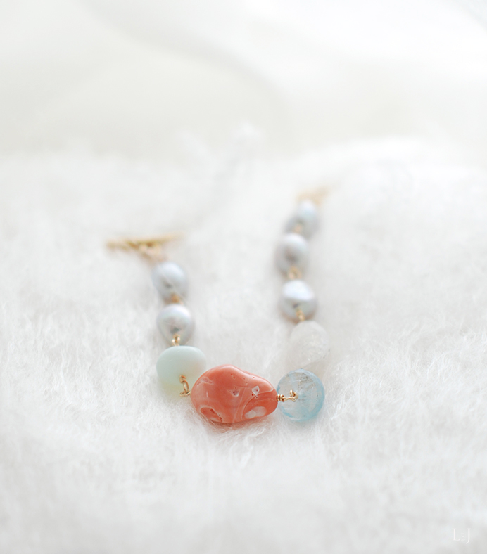 ウォームシルバーの淡水パールに、LeJらしい素材をちりばめました。白い天然石はホワイトムーンストーンのタンブル、ハンドカットのアクアマリン、惹きつけられてしまうような温かみと包容力を持った20mmサイズの天然のコーラル、何年も前に海外から仕入れたミントブルーが美しいペルー産ブルーオパール。