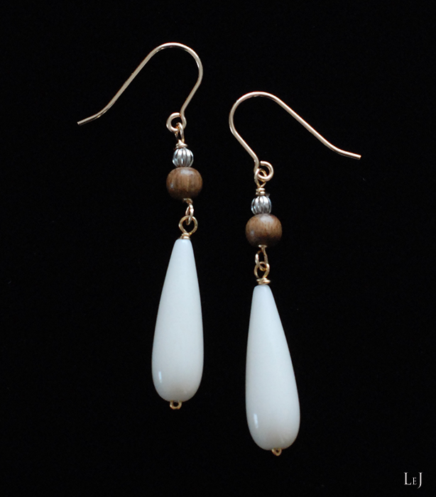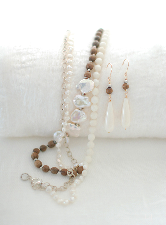 Amalfi26は、ボーンビーズとブラウンサンダルウッドのシンプルなピアス。ホワイト&ブラウンの色合わせはとても自由で、シルバーやターコイズ、パールとも仲良くなれます。
