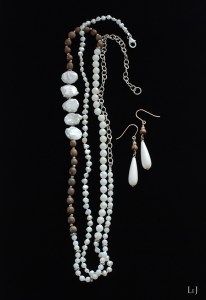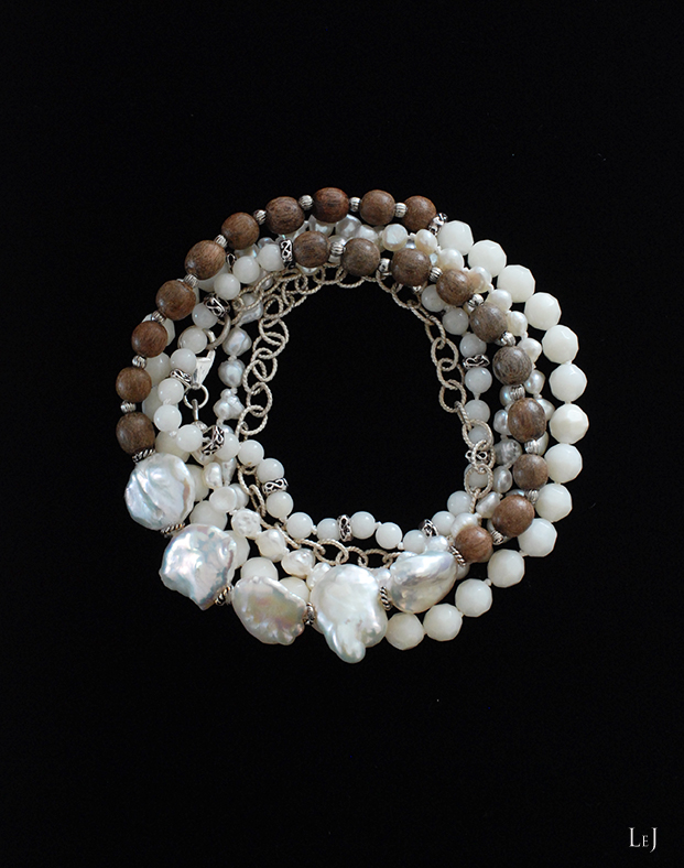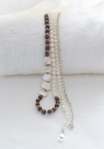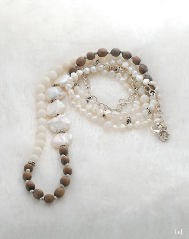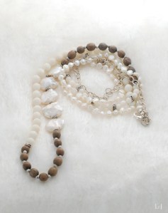 Amalfi25は、103cmのなかにパールやホワイトコーラル、ブラウンサンダルウッドでブラウン&ホワイトの物語を作ったようなネックレス。