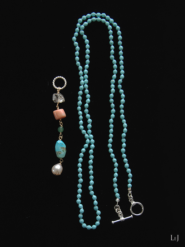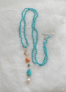 素材:アリゾナターコイズ・ピンクコーラルタンブル(ナチュラル)・あこやパール・グリーンクオーツファセッテドラウンド・ハーキマーカットクオーツ・ブルーマグネサイトファセッテドラウンド・K14ゴールドフィルド・シルバー925・メタル・シルク糸