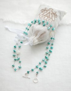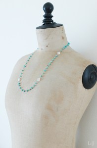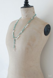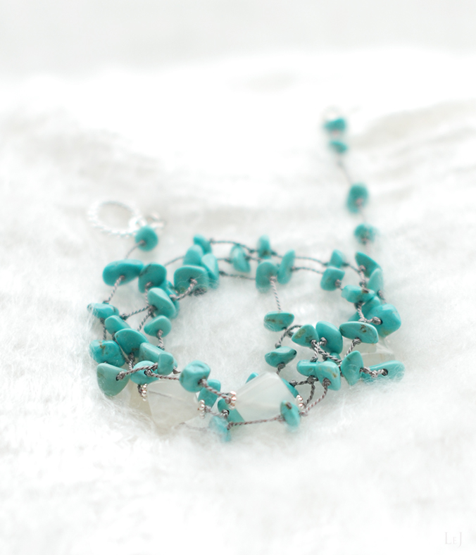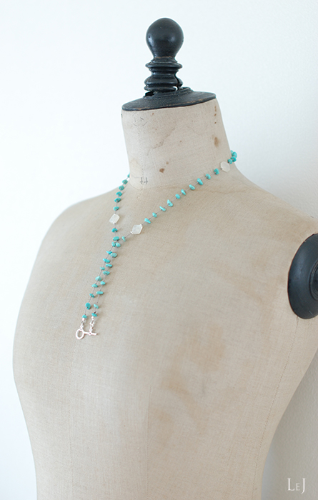 Rosita(ロジータ)は、LeJ(ルジィ)が海外から直接買い付けているネバダ州のキャリコレイクターコイズと、ふんわりとしたパフコインカットのホワイトムーンストーンをシルク糸で仕上げたネックレス。65cmのRosita-Aと83cmのRosita-Bがあります。