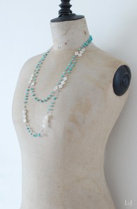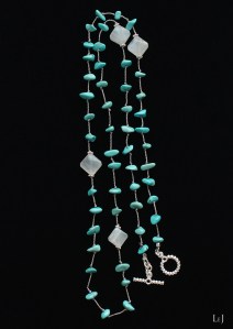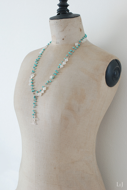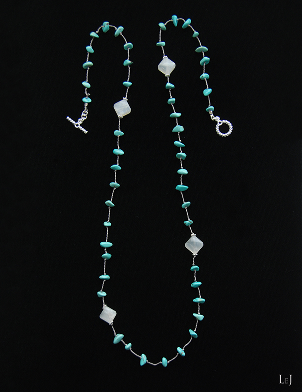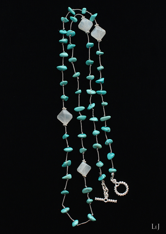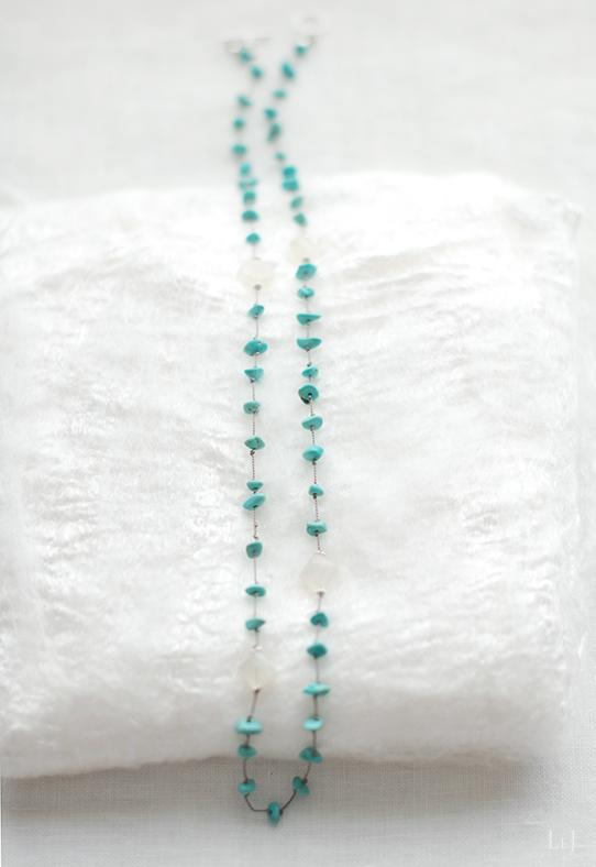 ターコイズはよどみのない美しさで、ホワイトムーンストーンはとてもめずらしいパフコインカットで斜めにホールが開いています。軽やかな仕上がりのネックレスは一点でも二点を合わせてもそれぞれにニュアンスがあって、ラリエットとしてもお使いいただけます。画像で二点のもつ雰囲気や違いをご覧いただければと思います。