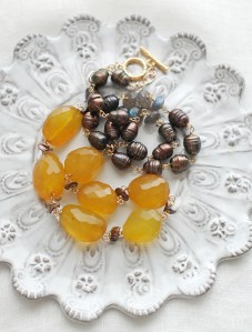 マロングラッセのようなカルセドニーはつやつやとしたカット。深い色合いがブラウンのパールとよく合うネックレスになりました。