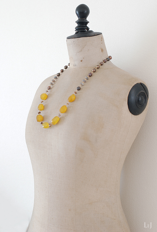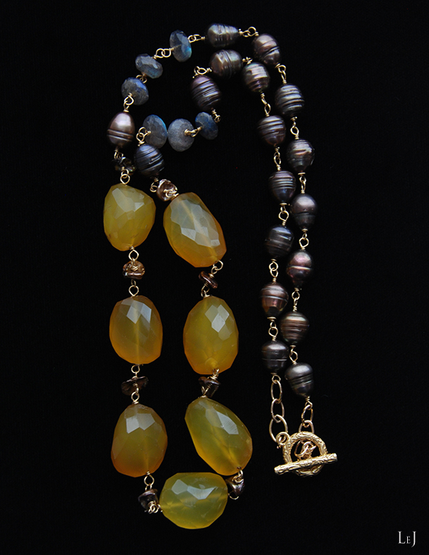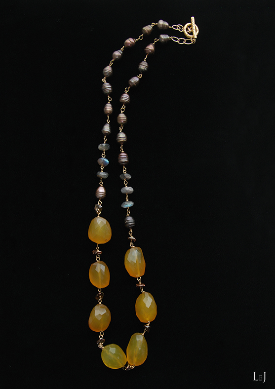 丁寧なカットのラブラドライトがトーンの調整役。マロンカルセドニーがバストちかくに集まるように、71cmで仕上げました。グレイ系、エクリュ、ブラウン系のニットによく合います。カルセドニーは24×18×16mmほど。大人の女性のデコルテとバストラインを美しく見せるネックレスです。