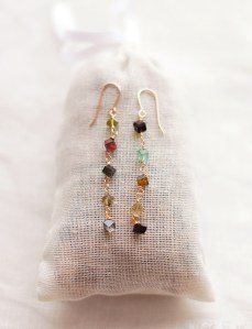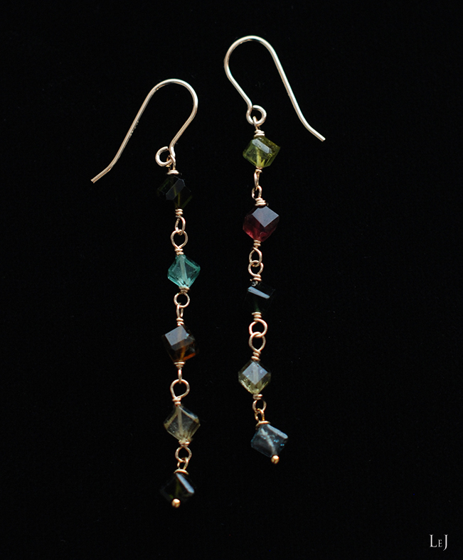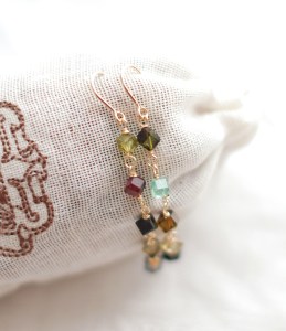 いろいろな色が入ったキューブシェイプのトルマリンでロングピアスを作りました。