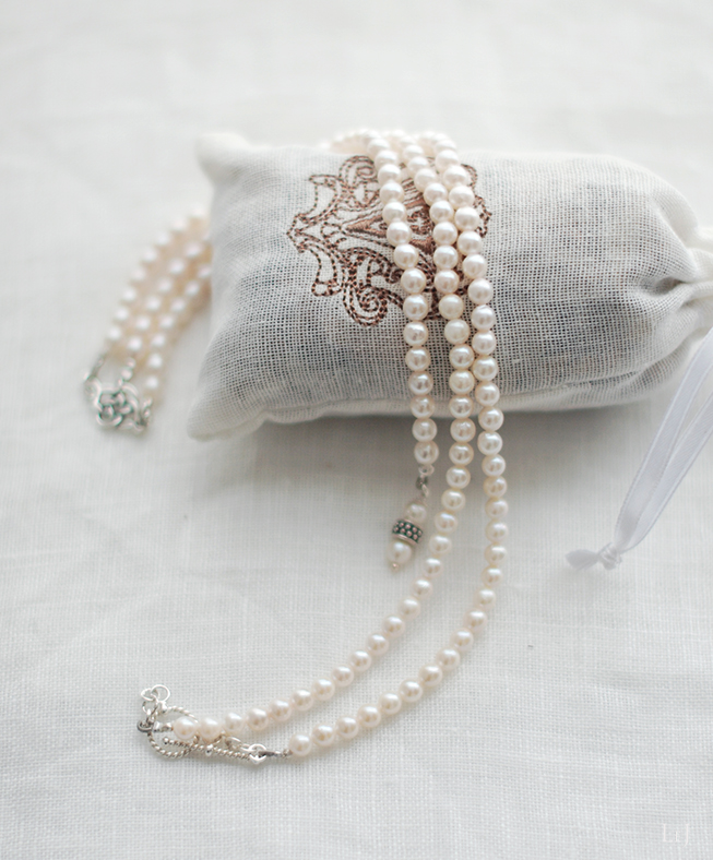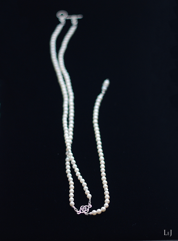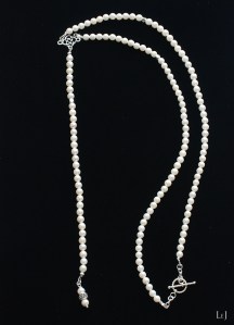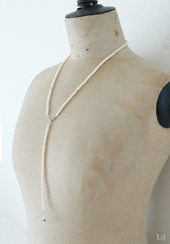 とても感じのよいあこやパール、個人的に大好きなY字シェイプで作ったものをもとに商品化しました。あこやパールは一粒ずつを結び留めるよりも、ある程度のまっすぐなラインを作って大切なところで一カ所だけ結び、シルバー925パーツを使っています。
