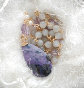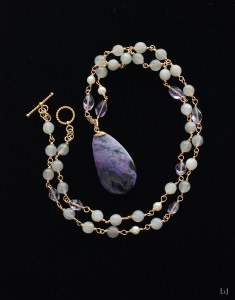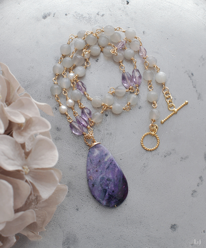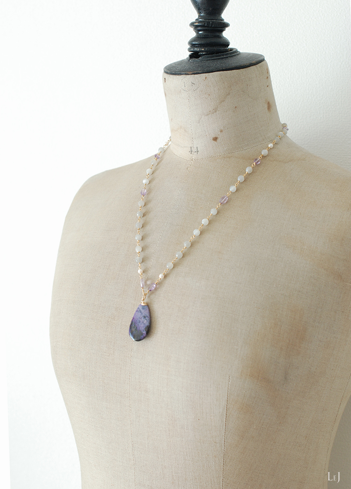 Lucrèce(リュクレース)はスギライトをトップに、アメジストとホワイトムーンストーン、あこやパールがマリアージュするネックレス。