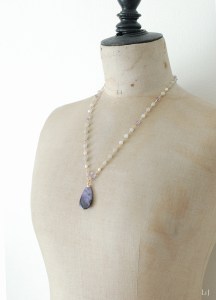 スギライトは、36mm×20mm×6mmのほどよい存在感。美しいマチエールのしっとりとした色合いの女性らしさを持った素材で、大切にストックしていました。K14ゴールドフィルドのチェーンで丁寧にネック部分とリンクして、ホワイトムーンストーンの落ち着いたイリデッセンスの光を湛えた素材と一緒にやわらかな印象のネックレスに。あこやパールも、小さくしっかりとしたアクセントとしての役目を持っています。